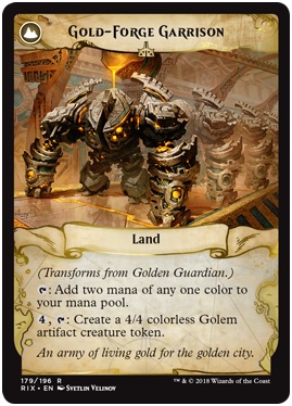 The Arch is amazing, as you should always have unlocked Ascend when you have the mana to activate it. Any ramp deck'll love it! We Also love the power of the double-exploring Jadelight Ranger or the self-Fighting Golden Guardian, who will always transform into the Gold-Forge Garrison. And in the meantime, a 4/4 defender still gives you a useful ability and helps your other stuff for the nonce until you want to flip it over!