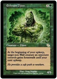 Erhnam Djinn was an iconic part of Magic's rich, deep history. It was one of the best cards from the early days of the game, and was reprinted in Chronicles and then used to sell the Beatdown duel box with an alternate art foil promo. And then we entered the era of the reprint selling a set, and Erhnam Djinn was one of the most iconic parts of the era. It was used in posters, magazine ads. The core concept of Judgment was a strong Green/White set. So, bringing back one of the best Green creatures of all time for Standard fit that perfectly. It was the perfect marriage of an iconic reprint as well as the right home for it. "Green is back!"