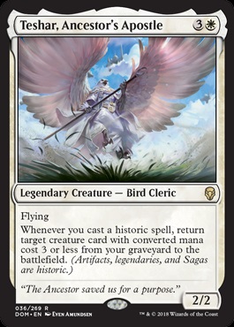 For example, you could cast 1-3-drop legendary creatures over and over again, bouncing them with the Curio and racking up triggers. In between, use STE to pull out every land from your library or kill people. In a very real way, Teshar is like an Enduring Renewal on legs. It's awesome. It's the most powerful card in Dominaria. And it's not even close!