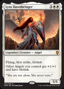 Clearly, Lyra Bringer of Dawns is evoking Baneslayer Angel here, hard. Is she better? I don't think so. Baneslayer's protection was quite pertinent and it's lack of legendary status meant you could drop more than one. You regularly run into both creature types in the sky where these Angels fight, and blocking an attacking big Dragon or swinging through a powerful Demon happens regularly. But the +1/+1 and lifelink to other Angels is quite good too, and Lyra brings some useful heat as a result. She's well sized and ready to make an impression anew at your kitchen table!