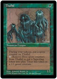 Ah yes, the Thallid! One of the strong iterations of the Fungus Among Us that made Saprolings. People played these a ton around the time of its release as the 1-drop that made the engine go. Later, when the mechanic was reintroduced in Time Spiral for that block, the initial Thallid was in the timeshifted sheet, and again, saw a new lease on life, especially with a Commander to lead the Saproling-making Fungus team -- Thelon of Havenwood. Of course, now you can run Slimefoot, the Stowaway if you prefer, in a post-Dominaria world.