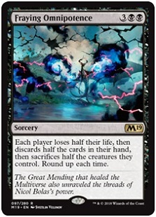 One of the great things about card evaluation from new sets is the ability to really compare new cards to the entire history of Magic cards. We know what appeals to casual mages. We know what they have been missing. We know what they want. Fraying Omnipotence brings a new tool to kitchen table gaming, and it feels like a powerful Pox effect. Each player loses life, dorks, and cards just like Pox. Pox hits lands too, but this goes for half of the cards. Different people will like this for that reason alone. Trust me. Folks are going to be building around Fraying Omnipotence long after Core Set 2019 rotates from Standard. We have taken notice of it!