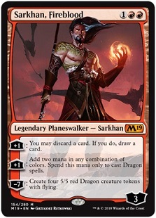 There are a few good things that any 3-drop planeswalker wants to bring to the table. As we know from playing with planeswalkers by now, the cheaper a 'walker can be, the more quickly it can come out, often earlier than someone can answer it. This is a great 3-drop that can begin looting as soon as it hits the table while having 4 loyalty for people to answer. If you failed to answer, then you now have two more mana the next turn. The looting alone is worth it, but in Commander Sarkhan will shine. There are a huge number of Commanders that are Dragons. Cast Sarkhan on turn three. Now on turn four, you can speed up your Dragon Commander by a full two turns. And if Sarkhan was also sped up with something like Sol Ring or a Birds of Paradise, then you can really push the speed of that Dragon-y Commander!