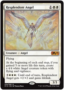 Don't sleep on this card for casual play. Casting cost matters. A 3/3 flyer in Mono-White for three mana is not something you'll normally have as an option. At least not with a disadvantage tethered to it. The only disadvantage with Resplendent Angel is that it's going to get targeted for removal. That's okay though, because the activation and potential for token-manufacturing is worth it. It has its own build in self-pump that can be useful later. Only one pump gets it to enough size to trigger its life gain token. That's pretty strong.
