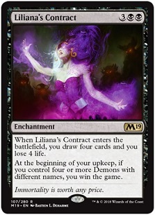 The good thing about the Contract is that you will automatically net four cards for four life on arrival. That's a lot of cards, especially in a format like Commander where you begin with 40 life and the four life-loss is paltry. Without doing anything else, her Contract is strong. This is one more mana, one more card, and one more life than commonly card draw effects like Ambition's Cost. You don't need synergy to make her work.