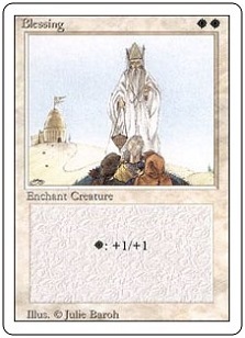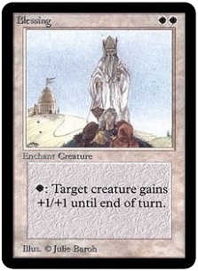 So, it's targeting, but just the dork it enchants? That's off. It was legal for tournaments or game play at the same time as Autumn Willow, and targeting language was being typified. So, if you spend a Green mana to enchant her with Blessing, then you would also have to spend a Green on future turns to pump her with Blessing! The most recent printing fixes it, and it now works as expected. Blessing is a fine card for an aura-based deck that wants to party with pumpage or is looking for a mana sink to invest mana in. I find a lot of my Green aura decks naturally are sitting on mana later just randomly, and this works. I also like those decks to run Skyshroud Elf as their mana Elf of choice as they can tap for Green, White, Red, or wash anything into its ally colors. Thus Blessing is even better. And I like running a cool black-bordered version from Beta even if it's a little beat up over a foil M14 version. Blessings Await!