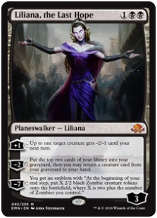 This is a 3-drop in just black, so Liliana is easier to cast both by color and by mana. And you know what? She can give you card advantage through both abilities which is key to card-advantage sensitive formats like Commander and/or multiplayer. The first will Weakness a creature for -2/-1. You certainly can’t argue with that on a 3-drop that’s hitting the table right around the time that that’ll kill stuff or shrink them for a full turn. And the second ability will let you mill yourself of two cards and Raise Dead to bring back the best creature from your graveyard to your hand. Repeatable Weakness and Raise Dead effects are really strong in casual land, especially when Liliana, the Last Hope hits the table early on. So you’ve got something here.