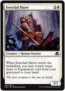 I blame Tempest. Just two sets earlier, we had the concept of a creature with an enters-the-battlefield trigger hit the collective Magic consciousness, and it was like a design-bomb just blew up player’s minds. We played the first cards from this era, Uktabi Orangutan, Nekrataal, Man-o'-War and friends very heavily. And then Tempest hit, and it brought the first of the flexible and useful recursive creatures with this effect in Gravedigger. By the end of the block we’d have Anarchist, Scrivener, and such all mucking about. You can return artifacts or enchantments. It’s good stuff. And today, from Sanctum Guardian to Custodi Squire, there’s a ton of options out there. But the Slayer is different than a lot of those. First, it returns either an aura or equipment. Both of those are very specific, but they work in different White-centric builds. Take Commander as a good example. You could have a White aura-centric deck built around Zur the Enchanter, Bruna, Light of Alabaster, Uril, the Miststalker, Daxos the Returned, or Krond the Dawn-Clad. Meanwhile, your equipment-loving Slayer works with Stoneforge Mystic in equipment loving shells. So you have both. But the Slayer is not a mid-cost-priced little 2/2 or 2/1 or something for 4 or 5 mana. Nope! It’s a 3/2 on the third turn. You get a powerful, cheap, on-curve threat, who also gets you the goods either then, or later on. That makes the Ironclad Slayer feel a little different to me. And . . .