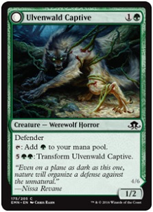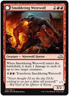 I love this card as a very interesting variant on creatures like Flametongue Kavu, Ghitu Slinger, Fire Imp, and such. You invest 4 mana, and the result is a 3/2 beater, slightly smaller than FTK. You also can shoot two creatures for one damage each, which gives you the potential to take out some smaller dorks. It comes down later enough that you can maximize the damage splitting and have more potential targets, like Birds of Paradise, Looter il-Kor, and stuff like that. So it can, at times, kill two creatures. It’s great for layering damage to finish stuff off, and you can play with the various engines and creatures with fun enters-the-battlefield tricks. Oh, and don’t forget that when you have the 6 mana, you can flip this guy to a 6/4 Eldrazi threat that does two damage to a player or creature when it attacks. That’s a major upgrade. The potential to get even more value from the Werewolf is incredible, and I can’t wait to start dropping Werewolves on Fire.