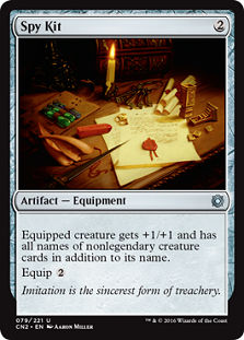 Spy Kit — This is a huge flavor win and Johnny tool. What do spies do? They can take the identity of others. So this equipment gives you that ability. Your creature has the names of all of the (nonlegendary) creatures out there. So that’s a great checkmark on the flavor list. Previously we only saw this ability on Blankman. The ability to use and abuse this is big. You can’t use it for stuff like grandeur of Korlash, Heir to Blackblade, but there’s enough out there for you to tease. Here, let me give you a handful of (unresearched) examples that are popping into my mind as I write this: