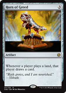 The Horn of Greed is almost like a better Howling Mine. You have it in your deck, so you can build around it more than others. It’s harder to purely dominate and run, but everyone still benefits, like Fecundity. That benefits leads folks to often skip taking out the Horn. I’ve seen these lay on the battlefield for much longer than they should have. (And remember, you don’t draw cards off land fetching like Rampant Growth, just on playing the land. Something like Exploration will trigger it.)