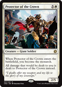 Protector of the Crown — As I mentioned above, White doesn’t have a lot of card drawing. So a creature that’s essentially free fills some holes. Becoming the Monarch helps with that. This is a useful Veteran Bodyguard as well as a powerful card drawing tool. And I’m sure you can come up with a few ways to abuse it…