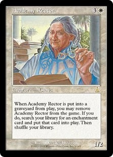 It's just unfair to invest three mana and an already-played artifact into the nastiest option in your deck straight onto the battlefield. While it takes more work to spin, the Academy Rector is just as bad, because it's not card disadvantage or with a counter-able sacrifice effect. Tinker remains one of the most iconic cards of its type.