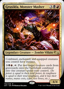 And then Grusilda plays into a powerful and obvious space for Magic. Hearkening back to mythology when two or more animals were used to create a third (such as Centaur or Griffon), we have a history of combining two into one. We have epic fantasy and Gary Gygax that similarly played into this space with Owlbears among many other creatures. Grusilda does the same, and feels very Innistrad in doing so. Here she can combine any other creatures from any graveyards (not just your own!) that have a little spice attached. Getting bonus power/toughness and abilities is just awesome. I really want to combine two legendary creatures that are different versions of each other, such as Akroma, Angel of Fury and Akroma, Angel of Wrath or Mirri, Cat Warrior and Mirri the Cursed. That’s awesome! You can find a ton of stuff to Grusilda.