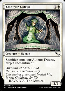 Beast in Show is literally a Beast version of Yavimaya Wurm. There’s no mechanical or flavor-based reason to ban Beast in Show. Shoot, there is no part of Amateur Auteur that could not be printed, as is, in black border. There is no over-kill joke in the name, creature type, casting cost, art, or even flavor text. You could print it in Commander 2018 without any getting upset. It’s a virtual reprint of a number of cards that do the same thing, such as Ronom Unicorn. So why ban cards like these when you don’t need to?