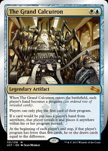 Consider Very Cryptic Command. It’s still a great card! But no part is as annoying as the card drawing and/or countering of the first one. Here, you can use this as a Winds of Change, not card advantage, or a tap, untap machine, or to recur an instant/sorcery. All have value, sure, but it’s not as onerous as its parent. Meanwhile, a card like The Grand Calcutron might look rough at first, but really shuts down a lot of junk. It’s going to be hard to be an annoying counter-deck and this is a great tool to deal with people that want to hoard cards and then counter all of your stuff rather than cast them and play the game.