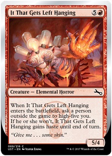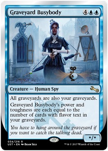 THANK YOU! This is my actual, proper, Top Five card for Unstable.This is a disturbingly good card. Forget the 2nd part of this card for a moment. Just imagine that every graveyard in the game is now yours. What does that mean? Well, you can flash back a card with flashback in your foe’s ‘yard. You get the bonuses for Anger or Wonder or the activated ability of Genesis or Champion of Stray Souls. Your reanimation stuff that would normally only do something with your own graveyard will now potentially target anything, such as Immortal Servitude or Obzedat's Aid. You’ll easily have threshold or spell mastery. And as this card shows, a creature that swells with the size of your graveyard will also do so with others. Mortivore is a good example. So there is a lot here to value. They probably put this ability on a creature to make sure that it was more easily answered! Also, note that the graveyards are still your opponents. It uses the English term, “also” so they are now both. That could create some interesting conversations when you cast Living Death.