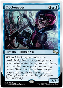 Just like your Goats, you better protect your Clocks! Clocknapper is a very intriguing card. Stealing an opposing phase is awesome. I think my default would be combat. I attack during my foe’s combat step! Pretty good, especially with stuff like vigilance or combat triggers. Stealing a main phase is fun too, and you could do some powerful stuff with beginning phase. If I didn’t have stuff to attack with, the beginning phase would be my default. You get to untap your stuff, get an upkeep, and then draw a card in the draw step. So you can replace it and get some additional effects if you have nothing else, so this is always a free card. And you can nap some clocks, so that’s nice.