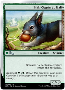 Wow are these cards awesome! I have included just a few above, but wowzers are they a hit out of the park. I want to give that person an Abe-Hug. All of these cards play into a great amount of space, with augment creatures and costs of all sorts up there. Take Half-Squirrel, Half- as a great example. Yes, it makes your Host a little smaller, but for an augment of