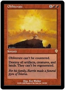 Obliterate defines the game as the most iconic and epic reset button. Now clever players have built around it in the past (have something phased out! Run enchantments! Creatures with death triggers that make more creatures (examples are Penumbra Wurm or Symbiotic Wurm)! Run something with indestructible! You get the idea).The combination of uncounterability and beefy removal including lands put Obliterate on the map as a major tool for players everywhere who think the board has gotten a little out of hand.