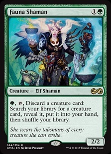 Fauna Shaman had precisely one appearance prior to now as a rare in a single Core Set, Magic 2011, which of course debuted in 2010, 8 years ago. Most Core Sets undersell the other sets, and weren't opened as much, so the market was unsatisfied with the number of these available. It's a Survival of the Fittest on legs, that taps to use its ability. For that reason, it's not as abusive as the card it evokes, but it's also not targeted like it either. I rarely have my early Fauna Shaman targeted in Commander. It gets multiple uses as I discard dorks I don't need for ones I do from my library and then I can cast them, as a single Green mana is hardly noticeable when I go to cast my fetched creature. She's great, and she's coming back! Fauna Shamans for you! Fauna Shamans for me! Fauna Shamans for everyone!