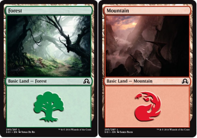 These lands feature a stalking darkness most suited to our theme. We can well imagine ourselves in these woods and rocky passes, glimpsing a shadow drawing closer. What was that? Did we just see two eyes glinting with Red hunger and Green savagery? Suddenly the narrow road we travel feels less safe, and we hurry on to find safety before dark.