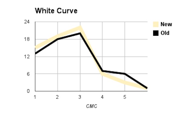 In composition, white added creatures, jumping from 73.85% monsters to 75.76%. This is still right where I want to be. White’s curve became more aggressive. Removing 5-drops and adding more aggressive 2-cost spells has pushed white firmly toward the aggressive camp. While the Aura-based removal allows for more controlling white decks, the color is now geared to beat down.