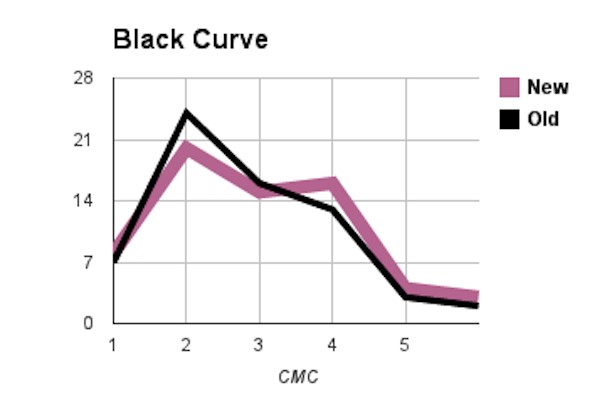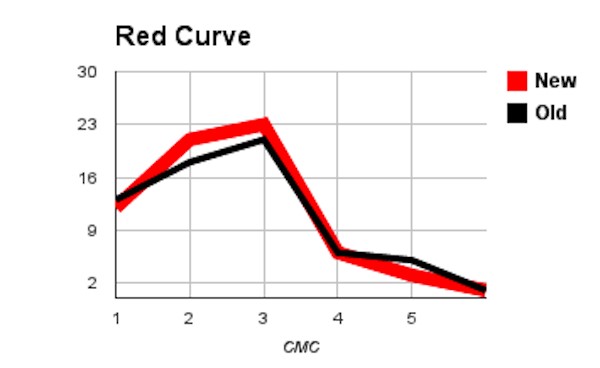 Blue remained its 60%/40% creature–spell balance, which is right where it wants to be. Blue’s curve also remains similar to its old form even though it has gained additional 2- and 3-drops. In the future, I will look for some solid 4-mana spells as potential inclusions.