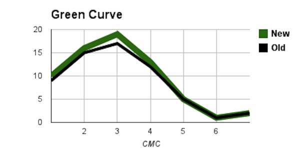Green was in a good place in terms of composition. In this update, it moved only a hair, going from 83.61% creatures to 83.33%, right where green should be. I added a more diverse spell suite, which should provide some options for green mages. Green’s curve remains largely unchanged aside from a spike at the 3 to a very reasonable level.