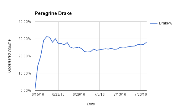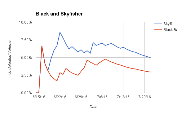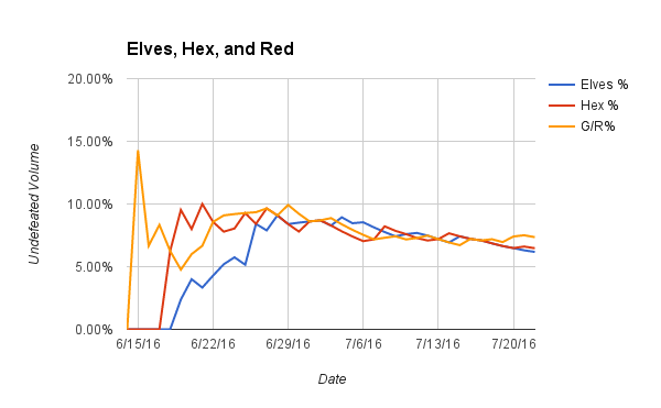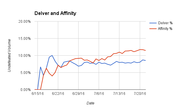 Drake decks have defined and dominated Pauper as of late. They achieved an apex at 31.25% of the metagame 3 days into the season but bottomed out two weeks later at 22.36%. Since July 2nd, they have steadily climbed in popularity to almost 28% of the undefeated metagame. There is not much to say that cannot be shown in the chart. Simply put, Drake is the best and is fairly insensitive to the relative success of other decks.