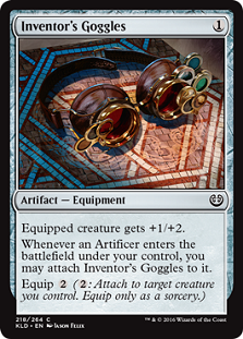 First up are the Goggles. Flayer Husk already sees play and while defense against Chainer's Edict and the like are nice the new piece of Equipment sets up for a turn two 5/6 Carapace Forger. By virtue of being complimentary Goggles frees up mana for adding additional threats to the board to while keeping a 2-drop out of Flame Slash range. It also has the benefit of turning Somber Hoverguard into a 4/4 and generally being a good card. The debate of Flayer Husk and Inventor’s Goggles will depend on the popularity of Black removal — when Chainer's Edict is popular we’ll see more Germs for sure.