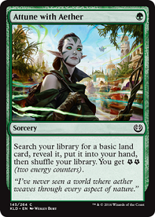 Attune with Aether is a great card when you have a way to expend the Energy it provides. Being able to find a land drop and generate an additional resource cannot be understated. A pseudo-Dark Ritual, Attune with Aether should see play when there is a good way to use up all those Energy counters. Until then this should see about as much play as Lay of the Land and Caravan Vigil.