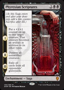 2.5 -- A slow Damnation that can grow and protect one of your own creatures. You can also preemptively play Phyrexian Scriptures, forcing your opponent to not play any creatures on their turn which will essentially Time Walk them. A great play with Phyrexian Scriptures is to just cast it on turn four, even if your opponent has one or fewer creatures. This will allow you to untap with a battlefield devoid of creatures. This will not only give you a tempo boost, but it will allow you to play a planeswalker with no creatures to pressure it. |