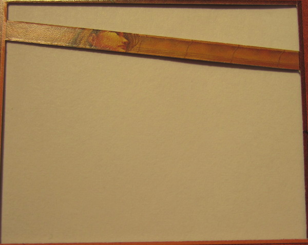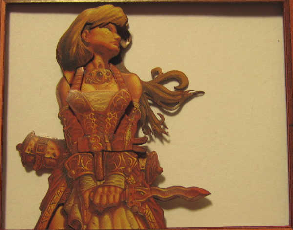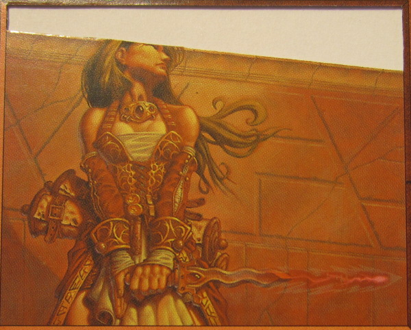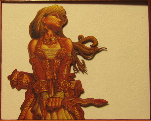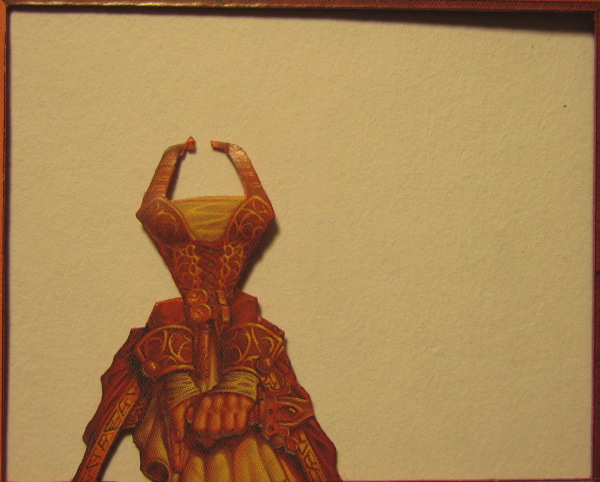 For the top layer, I use one of the foil copies Kris sent me. Old-border Red cards are designed to look like the border slants down toward the art and text box. I decide to make that slant real. Doing so requires the spacer behind the top layer to be smaller than a normal spacer. Bending the edges cleanly is tricky, but I end up with this:
