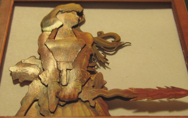 After I assembled the three primary mage layers and attached two of the detail pieces (the hair and the belt), the mage looked like this:
