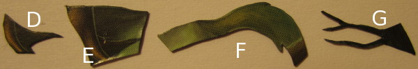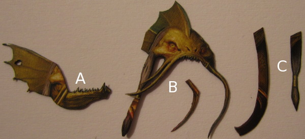 - The top fin is cut away from the head so that it can tuck behind the side fin on piece (A). Attaching the smallest piece of whisker to the rest of the head will be tricky, because it’s a tiny piece with an even tinier section where it makes contact with the other whisker for glue to be placed.