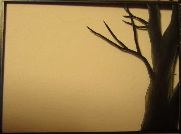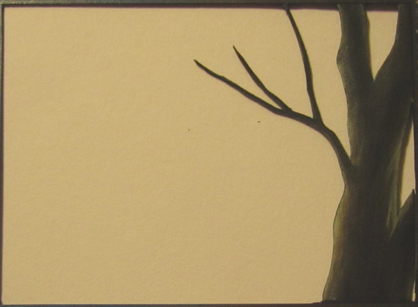 The small branches, piece (G), are attached. I also cut away the tree from the border of the card in multiple spots. This gives me more freedom to bend and shape the tree itself, rounding the trunk and branches with my pottery tools. This is one step I did not do the first time I worked on Sygg, as I was doing less shaping of pieces at the time.