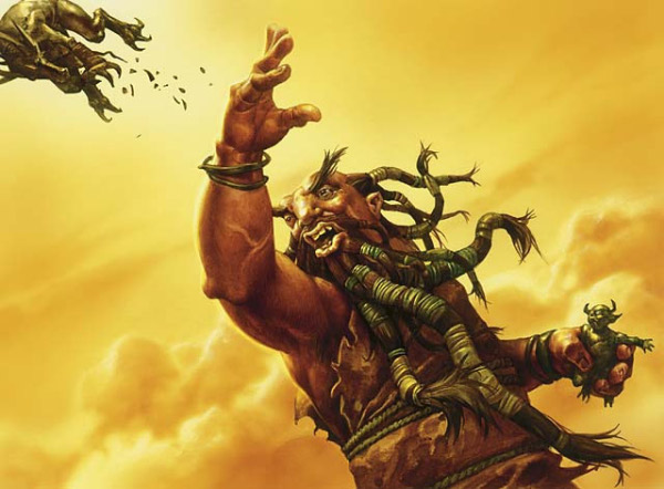In addition to having little to layer other than the main characters, Jenara and Brion share another challenging aspect: small floating objects. On Jenara, it’s her sigils; on Brion, it’s the bits of debris trailing behind the boggart that he’s chucking through the air. For examples of this type of challenge on other cards, consider the floating orbs around Sharuum the Hegemon or the bits of flame flying away from Ishi-Ishi, Akki Crackshot.