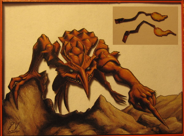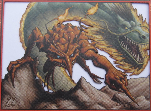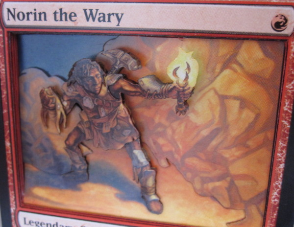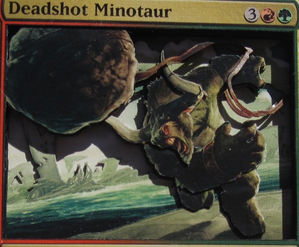 At this point, all of the layers and details are cut and ready to be fully assembled. However, the fire strands tied to Kiki-Jiki’s head are both very skinny and far from the dragon’s neck (the next layer where they exist). When an object is both skinny and far from the next layer where it exists, it is more distracting in the background. For example, look at this Deadshot Minotaur, the second 3D Magic card I ever made:
