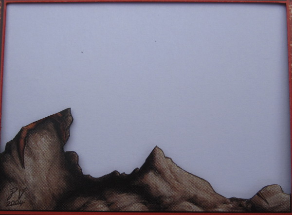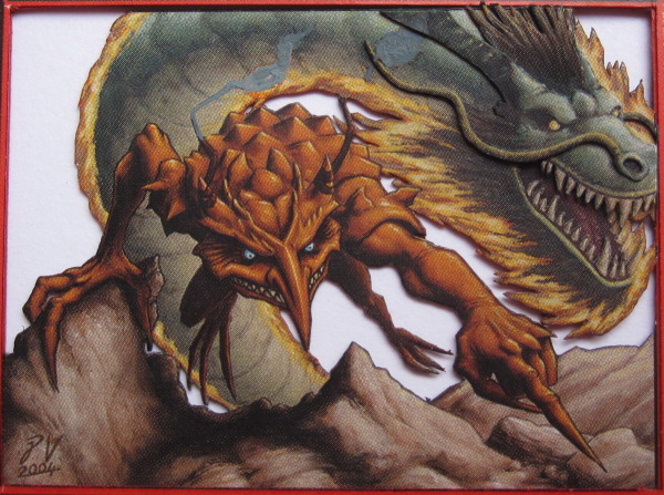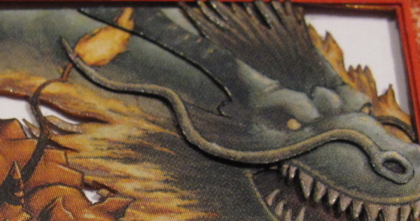 While doing this, I also decide to cut the dragon’s body and neck away from the borders of the card, leaving him attached only where his body disappears behind the rocks. This makes it possible to bend his body forward, making it look like he is forward toward the viewer.