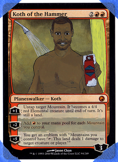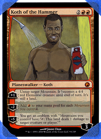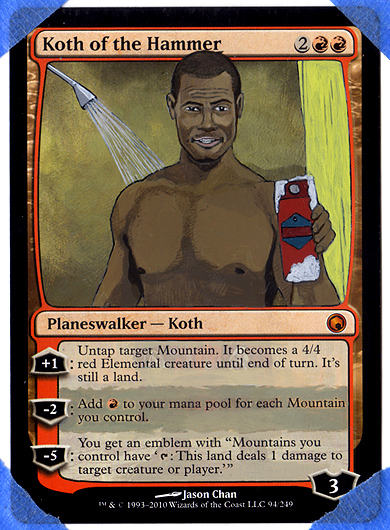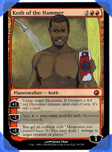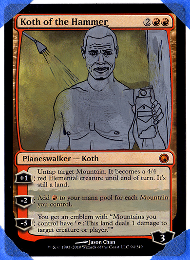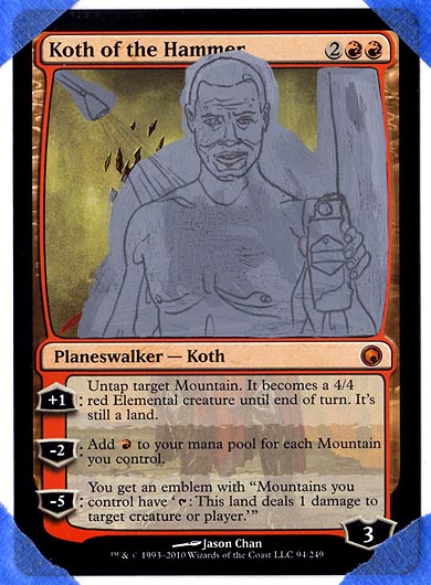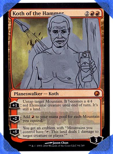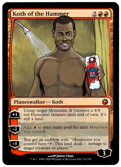 Well, you know what happened next. Trick and I worked out the details, and I picked up a copy of Koth at SCG Cincinnati. Up until now, I’ve kept the alteration details secret from JR so that the card can be presented to him at GenCon Indy. Trick will be attending, and better yet we already have a GatheringMagic staff dinner planned!