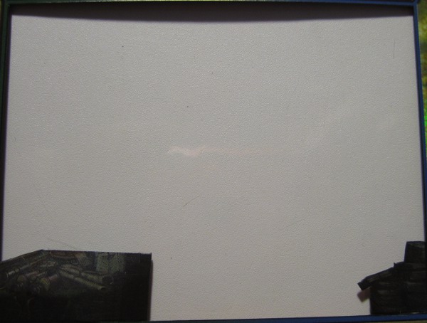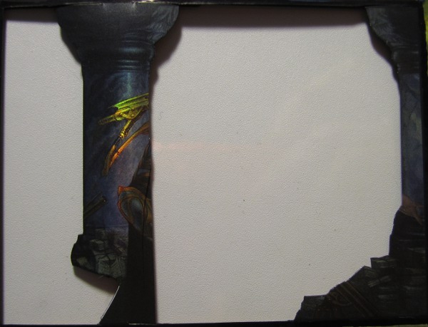 With so many detail pieces, I was running short on actual Edrics to cut up for the layers! Since the sky in the distance was such a small piece of visible art, my actual background layer ended up being just a small chunk of Edric glued to an oversized Ruhan of the Fomori— with a foam spacer on top: