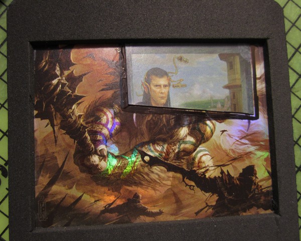 A factor I had to consider in planning this card was how the larger size would affect my process. At first, I thought that the larger art meant that the difficulty of cutting foils might be mitigated because the pieces I would be cutting would be slightly larger. When I compared the oversized card to a normal card, I realized that the larger size also meant that there were more details that it was possible to highlight.