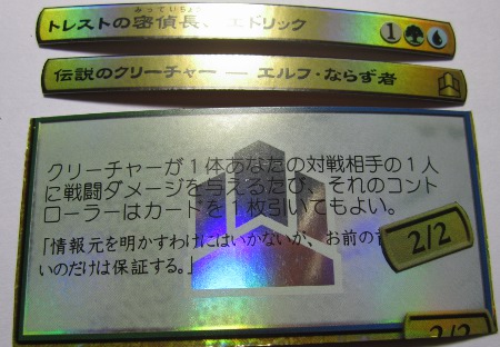 In addition to the regular foil oversized Edrics, Jesse sent along a Japanese copy to use for the text box and information boxes. I used most of that copy for the town layer, but I saved the important parts for later: