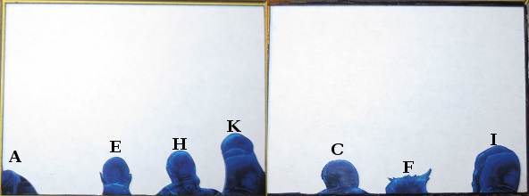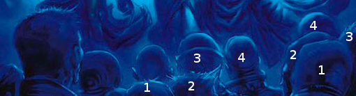 In each of those two clusters of heads, Head 1 partially overlaps Head 2, which overlaps 3, and so on. This meant that at a minimum, I would need four separate layers of heads. Next, I had to figure out what heads needed to be cut and which of them would be part of basic layers, still attached to the border of a card, and which would be free-floating detail pieces.