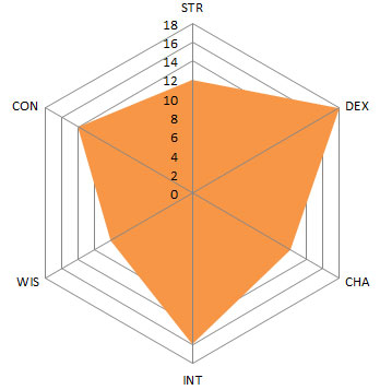 This is known as a radar plot. It provides a clean, visual way to showcase multiple axes of data for a single subject. In this particular case, I am showing you the stats for my third-level rogue in my current Dungeons & Dragons campaign. When most players think about Melvin and Vorthos, they tend to lump the two together with the Timmy-Johnny-Spike psychographics. If we were to create a radar plot to showcase how a typical casual Magic player might line up with each psychographic group, it might look something like this: