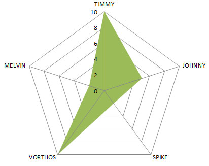 If Melvin and Vorthos are not psychographics as MaRo said, where do they show up on the Timmy-Johnny-Spike graph that defines each player? Mike Linnemann took a stab at this by saying that Melvin and Vorthos lie on a “Z-axis” while T-J-S share an X and Y axis.
