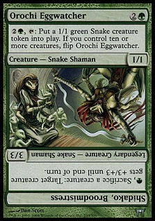 The Orochi of Kamigawa offer an interesting take on motherhood, showcasing the Eggwatchers who take care of massive hatcheries across the plane. Orochi Eggwatcher is an especially odd version, as her goal is to have ten children so she can flip and start sacrificing them for power.