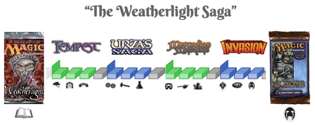 The crew also took part in a large, continuous story. The Weatherlight Saga is still considered to be the definitive epic of Magic lore. The story was told over four complete blocks (that's four years!) spanning from the Weatherlight expansion to Apocalypse.