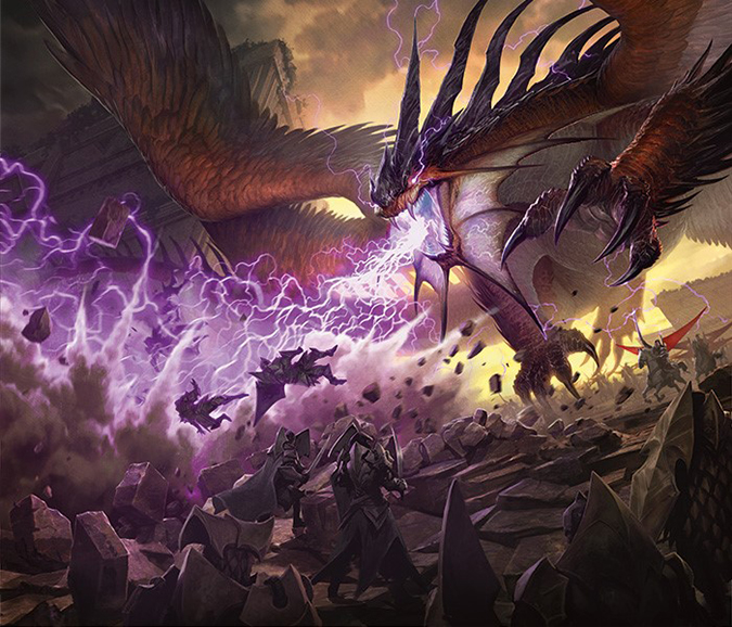 Let’s stop for a second and compare the dragon shown here to the Abzan dragon pictured above. Notice anything different? This dragon has feathers, has spines on its head, and breathes lightning, but most importantly, this dragon has two sets of wings. Why is that? Again, this is not on accident. The Mardu reveres the speed of the dragon, and its symbol is a pair of dragon wings. Perhaps this type of dragon has multiple wings that allow it to be an extremely fast flyer. Everything about this piece above promotes an idea of quickness and speed. Its face is more lithe and snakelike. Interesting that snakes are also known for their lightning-quick striking ability. Did I say lightning? Interesting. This dragon appears to be the epitome of speed. Moving forward, I will be referring to it as a Mardu dragon.